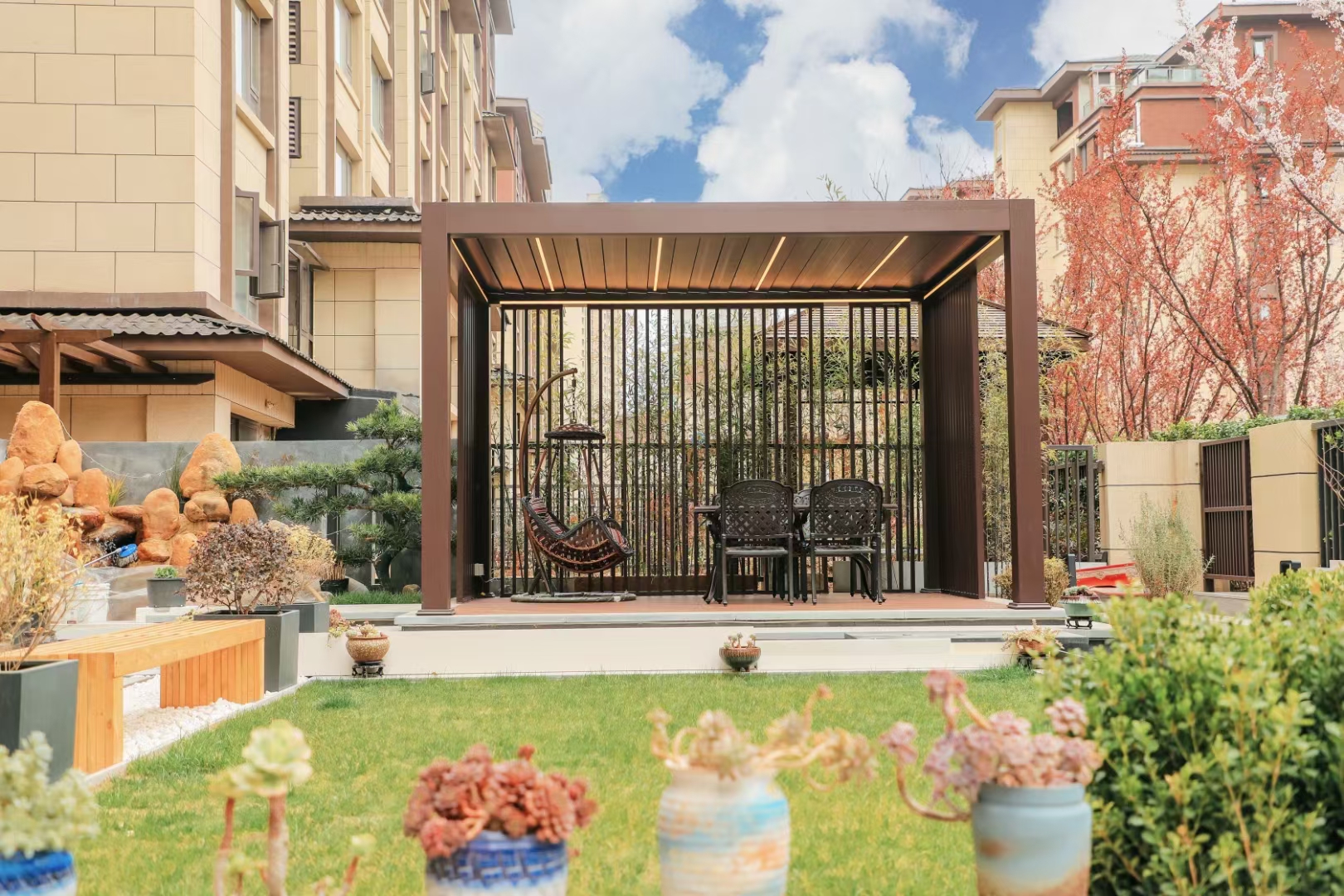 Structures from aluminum material are stronger andoffers exceptional strength for long-lasting durabili-ty. You can expect our aluminum pergolas to last fo!decades,even through snow and icy conditions.